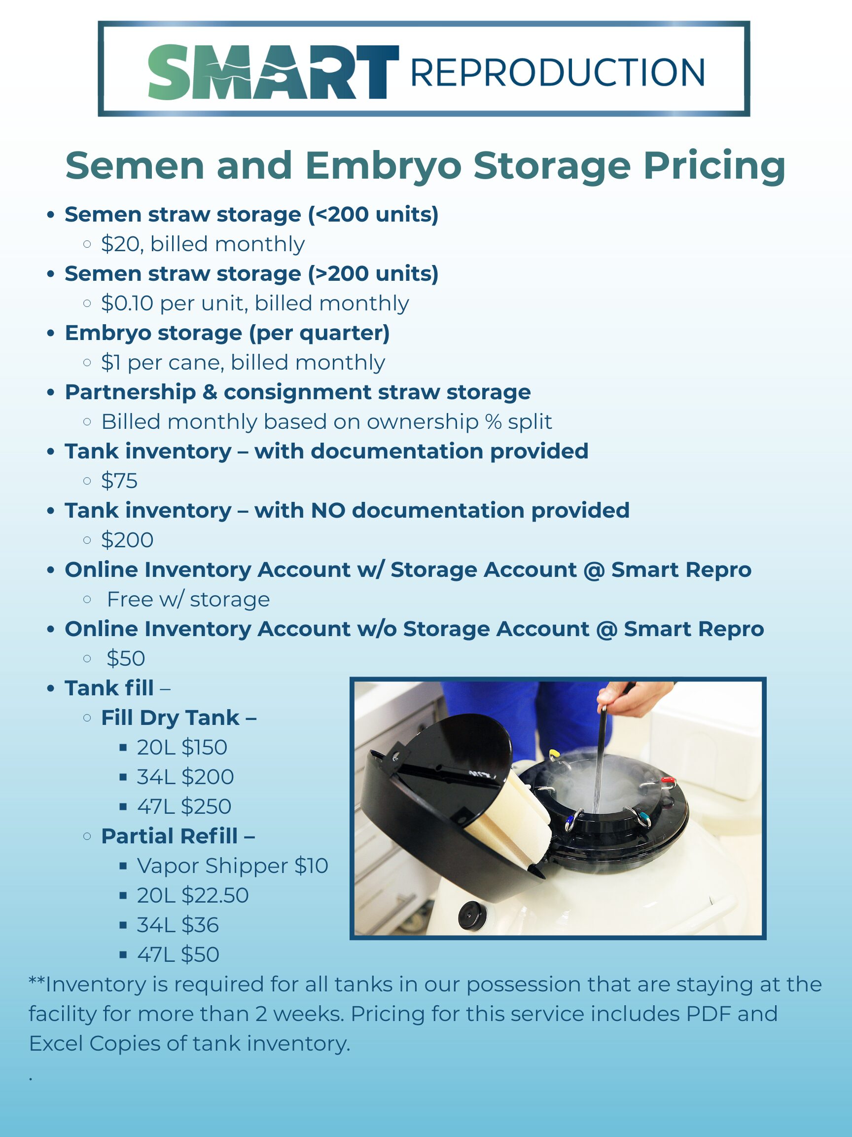SMART Reproduction is excited to offer short and long-term domestic and international semen and embryo storage for the following species: cattle, sheep, goat, deer, horse, dog, and cat.